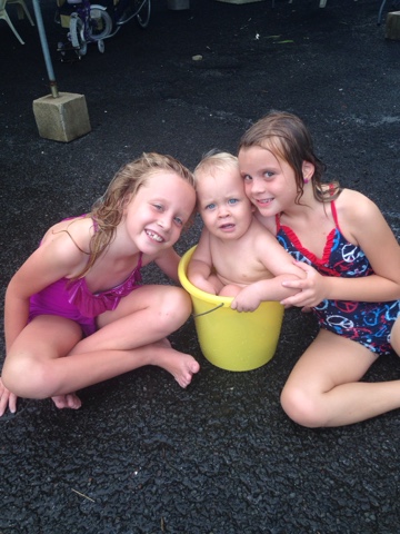 The girls like to fill up the bins with warm water and play. So of course, Bubs has to join in the fun.